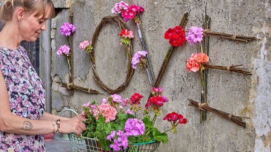 Nápis „Love“ (čiže láska) vyrobený z vŕbových vetvičiek a vyzdobený farebnými kvetmi muškátov tvorí prirodzenú nástennú dekoráciu a dodáva tejto nie príliš atraktívnej stene nový vzhľad. Aby kvety zostali svieže čo najdlhšie, umiestnite stonky do skúmaviek s vodou. Tie potom pripevnite k vŕbovým vetvičkám tenkým drôtom.