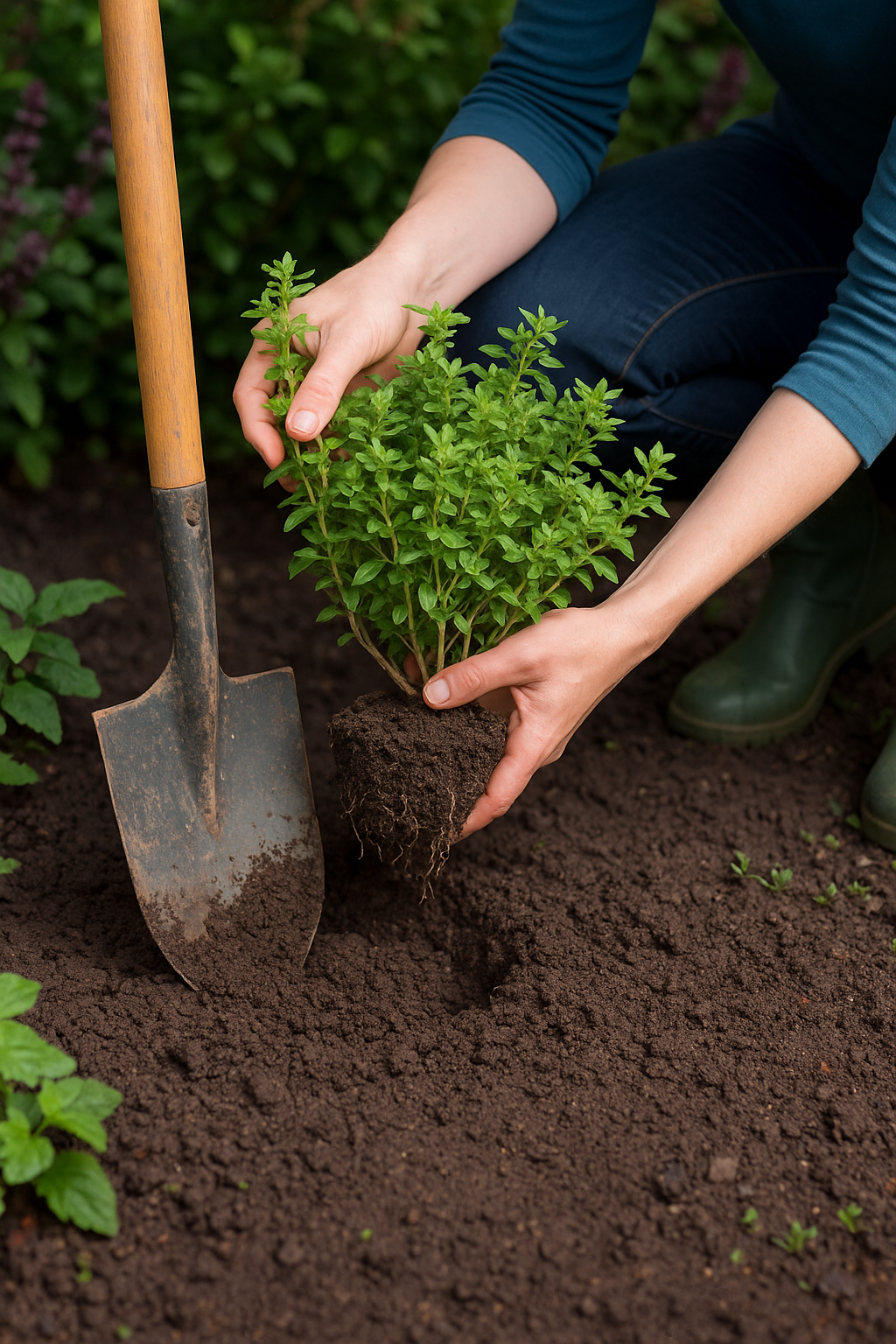 Bazalku v záhone opatrne podoberte rýľom, vyberte z pôdy a len čiastočne odstráňte pôdu z koreňov.