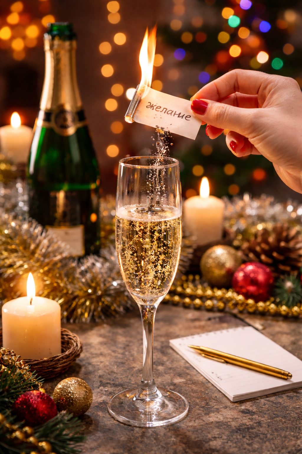 V Rusku patrí k silvestrovským rituálom zvyk, ktorý spája oheň, slová aj novoročný prípitok. Tesne pred polnocou si ľudia napíšu svoje želanie na malý papierik, ktorý po odbití hodín zapália. Popol z horiacich slov nasypú do pohára šampanského a nápoj vypijú ešte počas novoročného prípitku. Celý postup musí prebehnúť rýchlo a presne načas, inak sa podľa viery želanie nesplní. Zvyk vychádza z predstavy, že myšlienka premenená ohňom a prijatá telom má väčšiu šancu ovplyvniť nadchádzajúci rok.