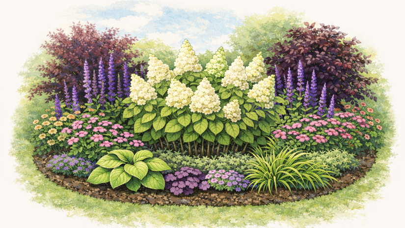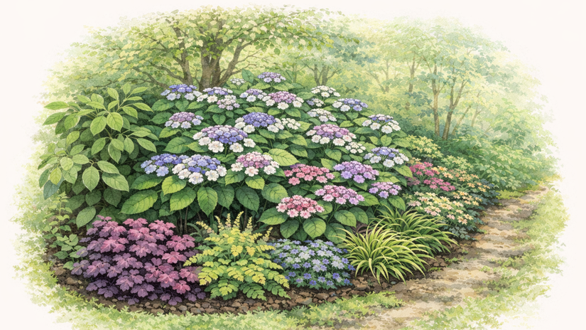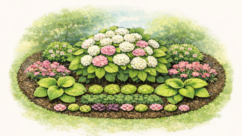 Táto výsadba je ideálna pre záhony pri dome, severné a východné strany alebo miesta pod stromami. Základ tvorí hortenzia kalinolistá (Hydrangea macrophylla) alebo hortenzia stromčekovitá (H. arborescens), vysadená ako hlavný bod. Pred ňu patria nižšie trvalky s výrazným listom, ktoré vytvoria pokojné pozadie a potlačia prázdne miesta pri zemi. Medzi jednotlivé kry je vhodné vložiť jemne kvitnúce druhy, ktoré neprerazia dominanciu hortenzie, ale ju zjemnia. Výsledkom je záhon, ktorý nepôsobí ťažko, ale má hĺbku a pokoj. Funguje od jari do jesene aj v rokoch, keď hortenzia kvitne slabšie. Táto kombinácia je vhodná pre ľudí, ktorí chcú „hotový efekt“ bez potreby každoročných zásahov.